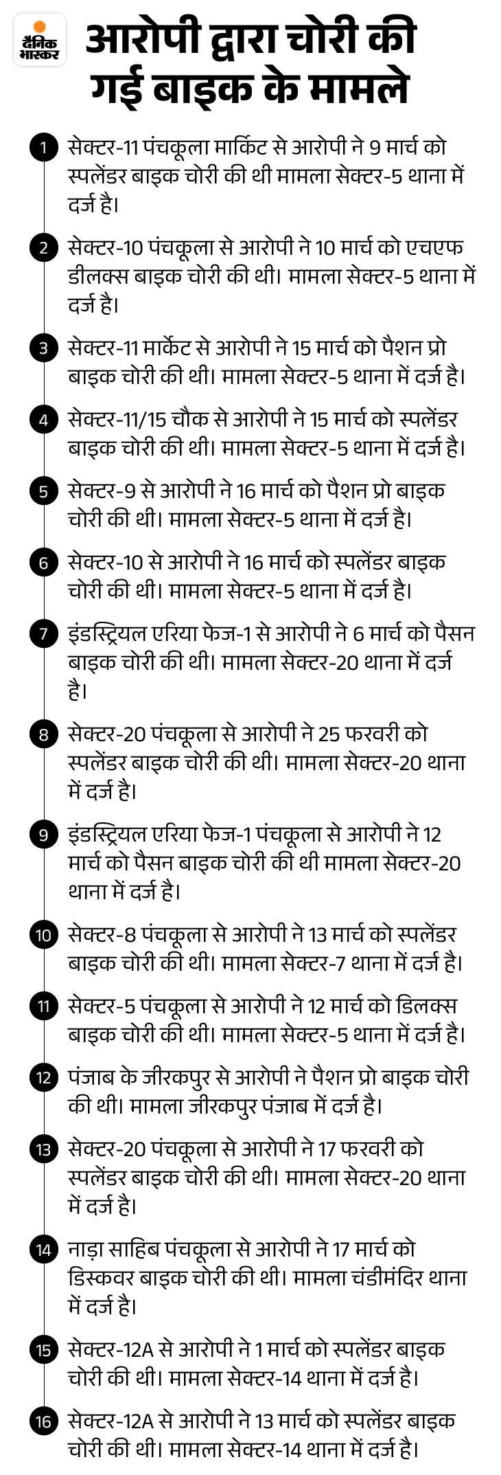 ਮੁਲਜ਼ਮ ਨੇ ਸੈਕਟਰ -11 ਨੂੰ ਸ਼ਾਨਦਾਰ, ਸੈਕਟਰ -10 ਤੋਂ ਐਚਐਫ ਡੀਲਕਸ, ਸੈਕਟਰ -9 ਤੋਂ ਜਨੂੰਨ ਪ੍ਰੋ ਬਾਈਕ ਤੋਂ ਜਨੂੰਨ ਪ੍ਰੋ ਬਾਈਕ ਤੋਂ ਜਨੂੰਨ ਪ੍ਰੋ. ਫਰਵਰੀ ਵਿੱਚ, ਸੈਕਟਰ -20 ਤੋਂ ਸ਼ਾਨੋ ਅਤੇ ਨਾਡਾ ਸਾਹਿਬ ਖੇਤਰ ਤੋਂ ਬਾਈਕ ਦੀ ਖੋਜ ਕਰੋ. ਪੁਲਿਸ ਜਾਂਚ ਤੋਂ ਪਤਾ ਚੱਲਿਆ ਕਿ ਦੋਸ਼ੀ ਨਸ਼ਿਆਂ ਦਾ ਆਦੀ ਸੀ. ਪਹਿਲਾਂ ਉਹ ਮਜ਼ਦੂਰ ਵਜੋਂ ਕੰਮ ਕਰਦਾ ਸੀ. ਚੋਰੀ ਹੋਈ ਸਾਈਕਲ ਜ਼ੀਰਕਪੁਰ ਅਤੇ ਪੰਚਕੁਲਾ ਵਿੱਚ ਵੱਖ-ਵੱਖ ਥਾਵਾਂ ਤੇ ਛੁਪਣ ਲਈ ਵਰਤੀ ਜਾਂਦੀ ਸੀ.
