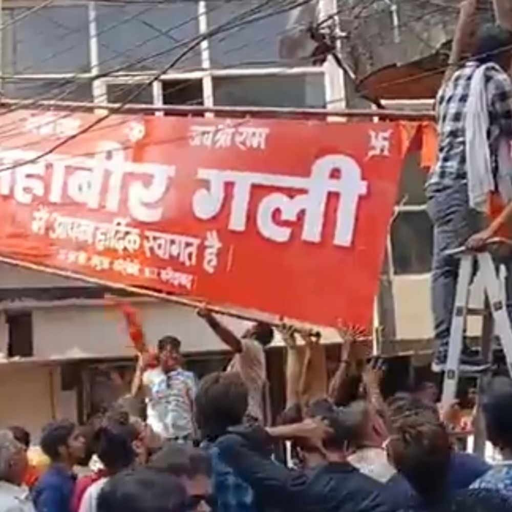 ਮਹਾਂਵੀਰ ਗੈਲ ਵਿੱਚ ਇੱਕ ਬੋਰਡ ਸਥਾਪਤ ਕਰਨ ਵਿੱਚ ਵਿਵਾਦ ਵਿੱਚ ਲੋਕ.