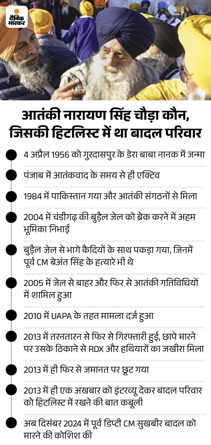 ਸ਼੍ਰੋਮਣੀ ਅਕਾਲੀ ਦਲ ਸੁਖਬੀਰ ਸਿੰਘ ਬਾਦਲ ਦੇ ਸਾਬਕਾ ਰਾਸ਼ਟਰਪਤੀ ਨੂੰ ਸੇਵਾ ਦੌਰਾਨ 3 ਦਸੰਬਰ ਨੂੰ ਦਰਬਾਰ ਸਾਹਿਬ ਵਿਖੇ ਗੋਲੀ ਮਾਰ ਦਿੱਤੀ ਗਈ ਸੀ. ਹਮਲਾ ਨਾਰਾਇਣ ਸਿੰਘ ਚੌਡਾ ਨੇ ਕੀਤਾ ਸੀ, ਜੋ ਪ੍ਰਧਾਨ ਗਤੀਵਿਧੀਆਂ ਨਾਲ ਜੁੜੇ ਹੋਏ ਸਨ. ਇਹ ਘਟਨਾ ਉਦੋਂ ਵਾਪਰੀ ਜਦੋਂ ਸੁਖਬੀਰ ਬਾਦਲ ਸ੍ਰੀ ਅਕਾਲ ਤਖ਼ਤ ਸਾਹਿਬ ਵਿਖੇ 2 ਦਸੰਬਰ ਨੂੰ ਲਗਾਈ ਗਈ ਵਾਕ ਤੋਂ ਬਾਅਦ ਸੇਵਾ ਕਰ ਰਹੇ ਸਨ. ਅਚਾਨਕ ਉਸ ਉੱਤੇ ਖੁੱਲ੍ਹ ਗਿਆ, ਜਿਸ ਨਾਲ ਹਫੜਾ-ਦਫੜੀ ਮਚਾਉਂਦੀ ਰਹੀ.