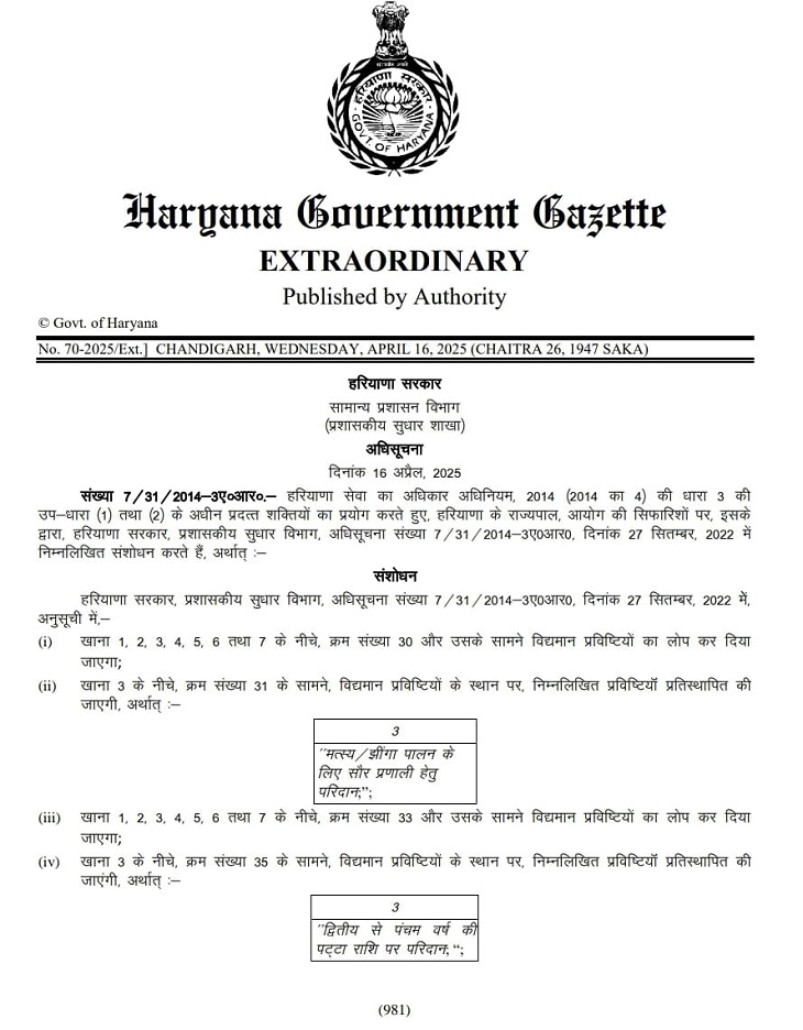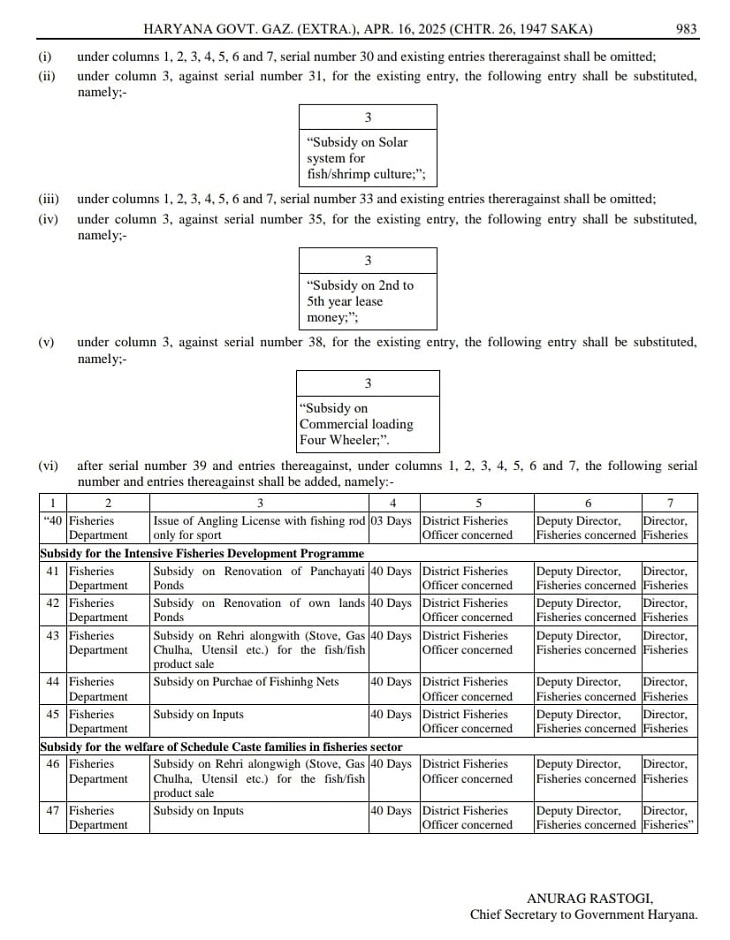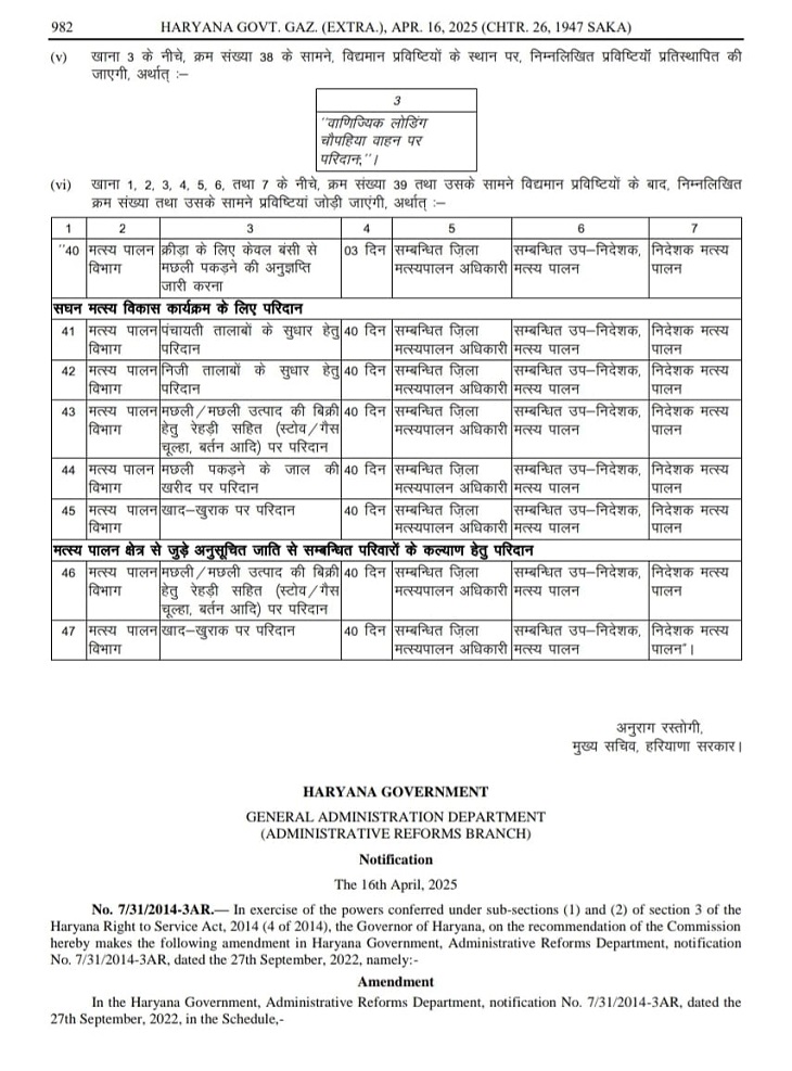 ਫਿਸ਼ਿੰਗ ਲਾਇਸੈਂਸ ਹੁਣ 3 ਦਿਨਾਂ ਵਿੱਚ ਹਰਿਆਣਾ ਵਿੱਚ ਉਪਲਬਧ ਹੋਵੇਗਾ. ਸਰਕਾਰ ਨੇ ਇਨ੍ਹਾਂ ਸੇਵਾਵਾਂ ਲਈ ਸਮਾਂ ਸੀਮਾ ਤੈਅ ਕੀਤੀ ਹੈ, ਮੱਛੀ ਪਾਲਣ ਵਿਭਾਗ ਦੀਆਂ 8 ਸੇਵਾਵਾਂ ਨੂੰ ਹਰਿਆਣਾ ਸੇਵਾ ਐਕਟ, 2014 ਨੂੰ ਲਿਆਉਣ ਲਈ ਇਕ ਨੋਟੀਫਿਕੇਸ਼ਨ ਦੇ ਮੁੱਖ ਸਕੱਤਰ ਅਨੁਰਾਗ ਰਾਸੋਗੀ
