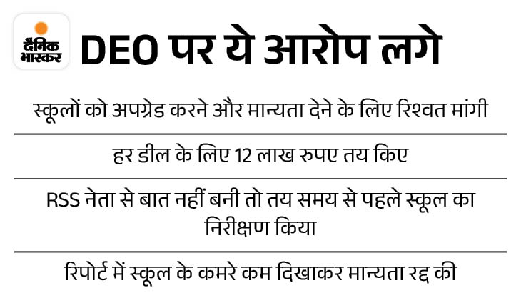 ਕੇਸ ਨੂੰ ਅੱਗ ਲੱਗ ਗਈ ਜਦੋਂ ਡੀਆਈਓ ਨੇ ਆਰਐਸਐਸ ਸਕੂਲ ਦੇ ਆਪਰੇਟਰ ਤੋਂ ਸਕੂਲ ਅਪਗ੍ਰੇਡ ਕਰਨ ਦੀ ਮਾਨਤਾ ਦੇ ਬਦਲੇ ਵਿੱਚ 12 ਲੱਖ ਰੁਪਏ ਦੀ ਮੰਗ ਕੀਤੀ. ਜਦੋਂ ਆਰਐਸਐਸ ਦੇ ਨੇਤਾ ਨੇ ਪੈਸਾ ਨਹੀਂ ਦਿੱਤਾ, ਸਕੂਲ ਨੇ ਆਪਣੀ ਮਾਨਤਾ ਨੂੰ ਘਟਾ ਦਿੱਤਾ ਅਤੇ ਰੱਦ ਕਰ ਦਿੱਤਾ.
