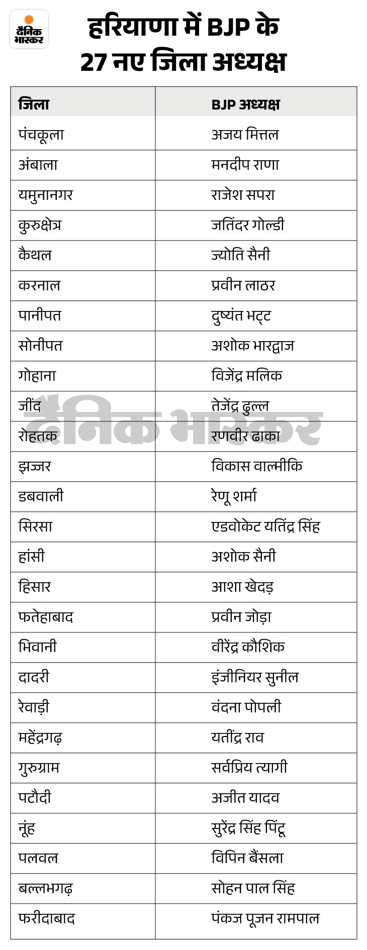 ਸਰਕਾਰ ਹਰਿਆਣੇ ਦੇ 5 ਨਵੇਂ ਜ਼ਿਲ੍ਹਿਆਂ ਬਣਾਏਗੀ: ਭਾਜਪਾ 22 ਦੀ ਬਜਾਏ 27 ਜ਼ਿਲ੍ਹਾ ਪ੍ਰਧਾਨ ਬਣਾ ਰਹੀ ਹੈ, ਜਿਸ ਵਿੱਚ ਹਾਂਸੀ ਅਤੇ ਗ੍ਰੇਟਰ ਗੁਰੂਗ੍ਰਾਮ ਸ਼ਾਮਲ ਹਨ