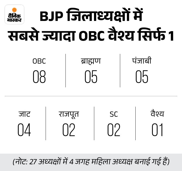 ਬੀਬੀਸੀ ਕਲਾਸ ਦੀ ਮਦਦ ਕਰਨ ਲਈ ਭਾਜਪਾ ਨੇ ਸਭ ਤੋਂ ਵੱਧ ਜ਼ਿਲ੍ਹਾ ਪ੍ਰਧਾਨਾਂ ਦੀ ਗਿਣਤੀ ਕੀਤੀ ਹੈ. ਇਸ ਤੋਂ ਇਲਾਵਾ, 5 ਬ੍ਰਹਮਿਨ, 4 ਜਾਤੀਆਂ, 2 ਰਾਜਪੰਤ, 2 ਰਾਜਪੂਤ, 2 ਰਾਜਪੂਤ, 2 ਐਸਸੀਐਸ ਅਤੇ ਜ਼ਿਲ੍ਹਾ ਪ੍ਰਧਾਨਾਂ ਨੂੰ ਇਕ ਬਾਨੀਆ ਦੀ ਸ਼੍ਰੇਣੀ ਤੋਂ ਬਣਾਇਆ ਗਿਆ ਹੈ. ਇਨ੍ਹਾਂ ਵਿੱਚ 4 women ਰਤਾਂ ਸ਼ਾਮਲ ਹਨ.