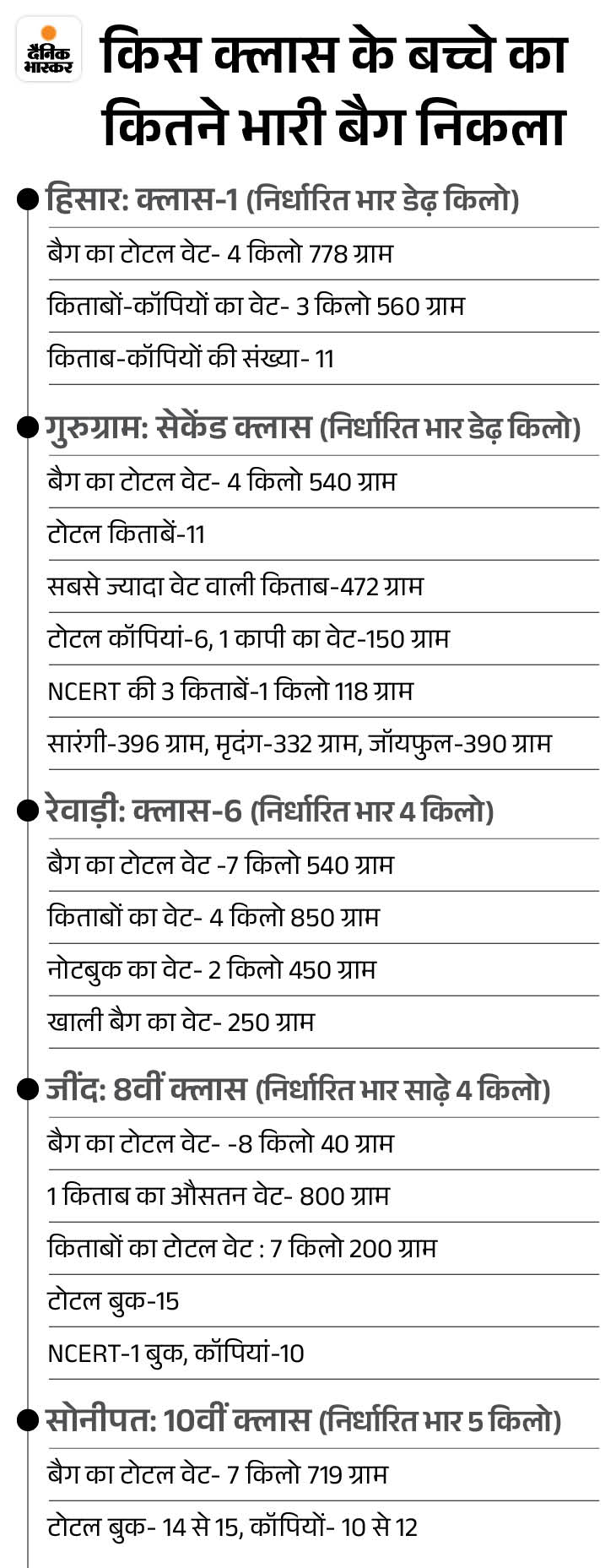 ਹਿਸਾਰ ਵਿੱਚ, ਪਹਿਲੀ ਜਮਾਤ ਦੇ ਬੈਗ ਦਾ ਭਾਰ 4 ਕਿਲੋ 778 ਗ੍ਰਾਮ ਬਣ ਗਿਆ, ਜਦੋਂ ਕਿ ਬੈਗ ਦਾ ਭਾਰ ਇੱਕ ਅਤੇ ਅੱਧੇ ਕਿੱਲੋ ਹੋਣਾ ਚਾਹੀਦਾ ਹੈ.
