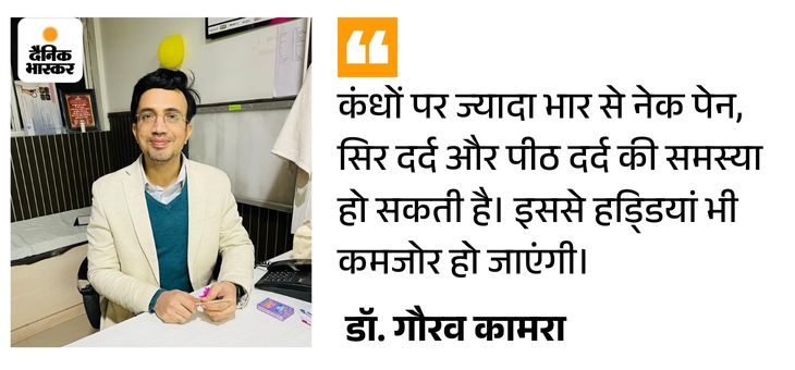 ਡਾਕਟਰ ਨੇ ਕਿਹਾ- ਵਧੇਰੇ ਭਾਰ ਰੀੜ੍ਹ ਦੀ ਪੇਸਟ ਨੂੰ ਵਿਗਾੜ ਦੇਵੇਗਾ ਹੱਡੀਆਂ ਦਾ ਡਾਕਟਰ ਗੌਰਵ ਕਾਮਰਾ ਨੇ ਕਿਹਾ ਕਿ ਰੀੜ੍ਹ ਦੀ ਆਸਣ ਭਾਰ ਦਾ ਭਾਰ ਚੁੱਕ ਕੇ ਖਰਾਬ ਹੋ ਗਿਆ ਹੈ. ਮਾਸਪੇਸ਼ੀ ਨੂੰ ਪ੍ਰਭਾਵ. ਭਵਿੱਖ ਵਿੱਚ ਦਰਦ ਦੀ ਸਮੱਸਿਆ ਹੋ ਸਕਦੀ ਹੈ. ਬੈਗ ਦਾ ਭਾਰ ਬੱਚੇ ਜਾਂ ਕਲਾਸ ਦੀ ਉਮਰ ਦਾ ਫੈਸਲਾ ਕਰਨਾ ਗਲਤ ਹੈ. ਇਹ ਬੱਚੇ ਦੇ ਭਾਰ ਦੇ ਅਨੁਸਾਰ ਹੋਣਾ ਚਾਹੀਦਾ ਹੈ. ਮੰਨ ਲਓ ਕਿ ਬੱਚਾ 10 ਕਿਲੋਗ੍ਰਾਮ ਹੈ ਅਤੇ ਬੈਗ ਦਾ ਭਾਰ ਇੰਨਾ ਜ਼ਿਆਦਾ ਹੈ, ਤਾਂ ਉਸਨੂੰ ਬਹੁਤ ਮੁਸ਼ਕਲ ਦਾ ਸਾਹਮਣਾ ਕਰਨਾ ਪਏਗਾ.