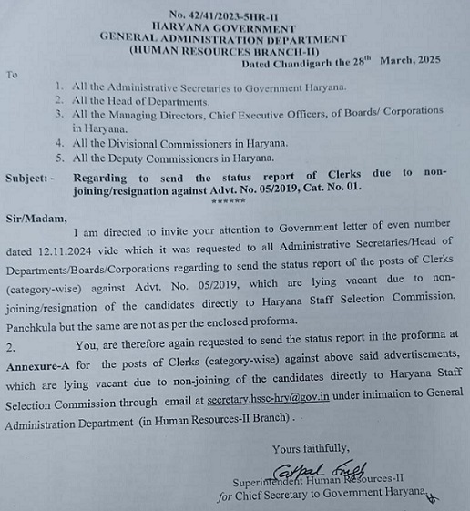 ਹਰਿਆਣਾ ਵਿਚ 7 ਸਾਲਾਂ ਬਾਅਦ, ਪੁਰਾਣੀ ਕਲਰਕ ਭਰਤੀ ਦੁਬਾਰਾ ਖੋਲ੍ਹਣ ਜਾ ਰਹੀ ਹੈ. ਹਰਿਆਣਾ ਸਰਕਾਰ ਦੇ ਪਰਸਨਲ ਵਿਭਾਗ ਨੇ ਹਰਿਆਣਾ ਦੇ ਸਟਾਫ ਚੋਣ ਕਮਿਸ਼ਨ (ਐਚਐਸਐਸਸੀ) ਤੋਂ ਕਲਰਕ ਭਰਤੀ 5/2019 ਦੇ ਖਾਲੀ ਅਹੁਦੇ ਦੀ ਰਿਪੋਰਟ ਮੰਗੀ ਹੈ.