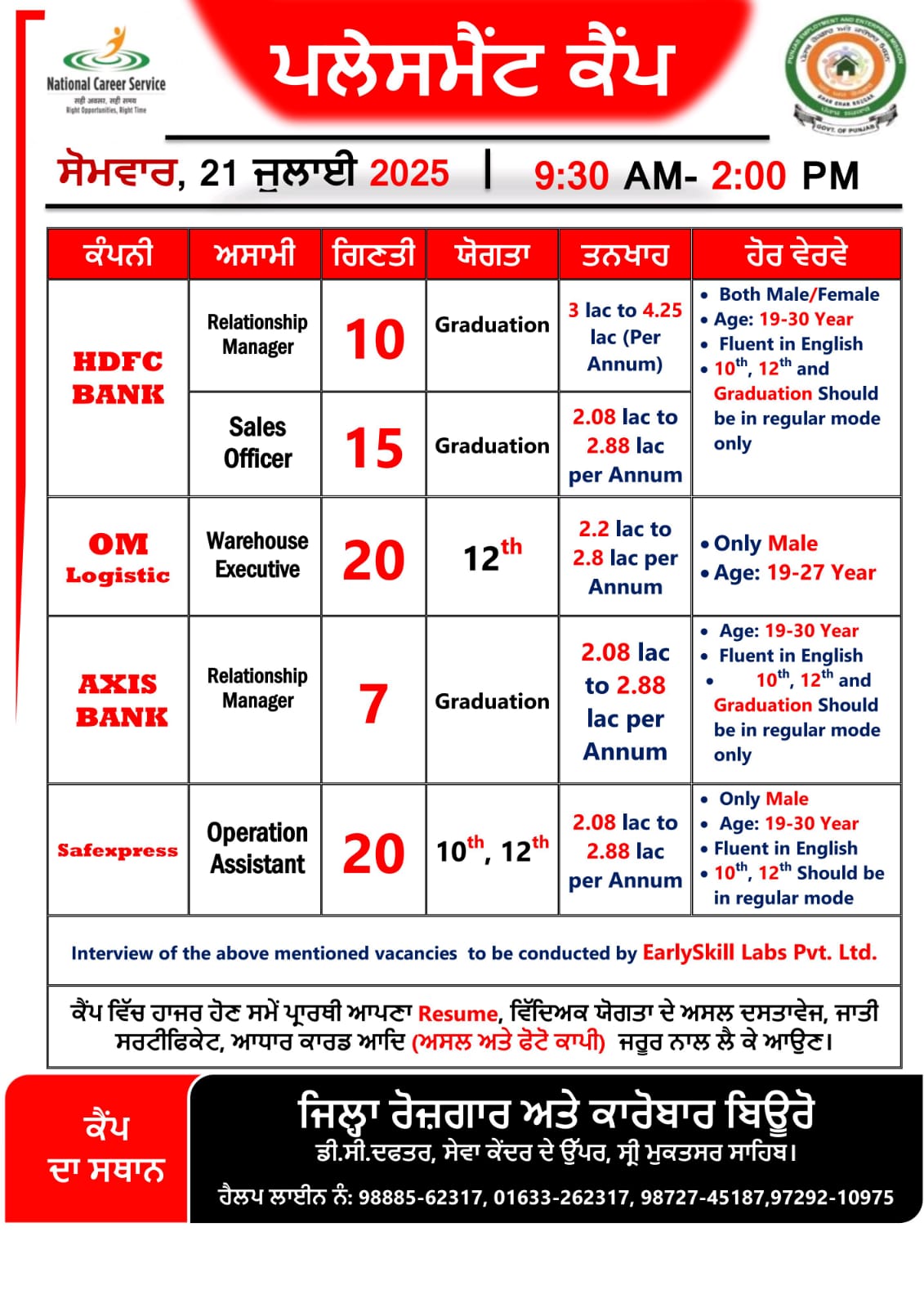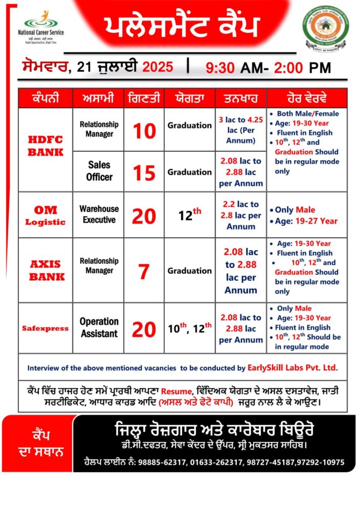 Punjab Desk : ਜਿਲ੍ਹਾ ਰੋਜ਼ਗਾਰ ਅਫ਼ਸਰ ਕੰਵਲਪੁਨਿਤ ਕੌਰ ਨੇ ਜਾਣਕਾਰੀ ਦਿੰਦੇ ਹੋਏ ਦੱਸਿਆ ਕਿ ਜਿਲ੍ਹਾ ਰੋਜ਼ਗਾਰ ਅਤੇ ਕਾਰੋਬਾਰ ਬਿਊਰੋ, ਸ੍ਰੀ ਮੁਕਤਸਰ ਸਾਹਿਬ ਵਿਖੇ 21 ਜੁਲਾਈ 2025 ਸੋਮਵਾਰ  ਨੂੰ ਪਲੇਸਮੈਂਟ ਕੈਂਪ ਲਗਾਇਆ ਜਾ ਰਿਹਾ ਹੈ।