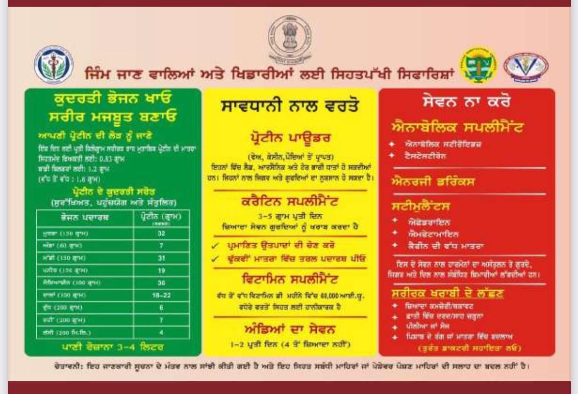 ਉਨ੍ਹਾਂ ਕਿਹਾ ਕਿ ਕੁਦਰਤੀ ਭੋਜਨ ਖਾਓ ਅਤੇ ਇੱਕ ਦਿਨ ਦੀ ਸਿਹਤਮੰਦ ਵਿਆਕਤੀ ਲਈ 0.83 ਗ੍ਰਾਮ ਅਤੇ ਬਾਡੀ ਬਿਲਡਰਾਂ ਲਈ 1.2 ਤੋਂ 1.6 ਗ੍ਰਾਮ ਪ੍ਰਤੀ ਕਿਲੋ ਭਾਰ ਮੁਤਾਬਿਕ ਪ੍ਰੋਟੀਨ ਦੀ ਮਾਤਰਾ ਲੈਣੀ ਚਾਹੀਦੀ ਹੈ।