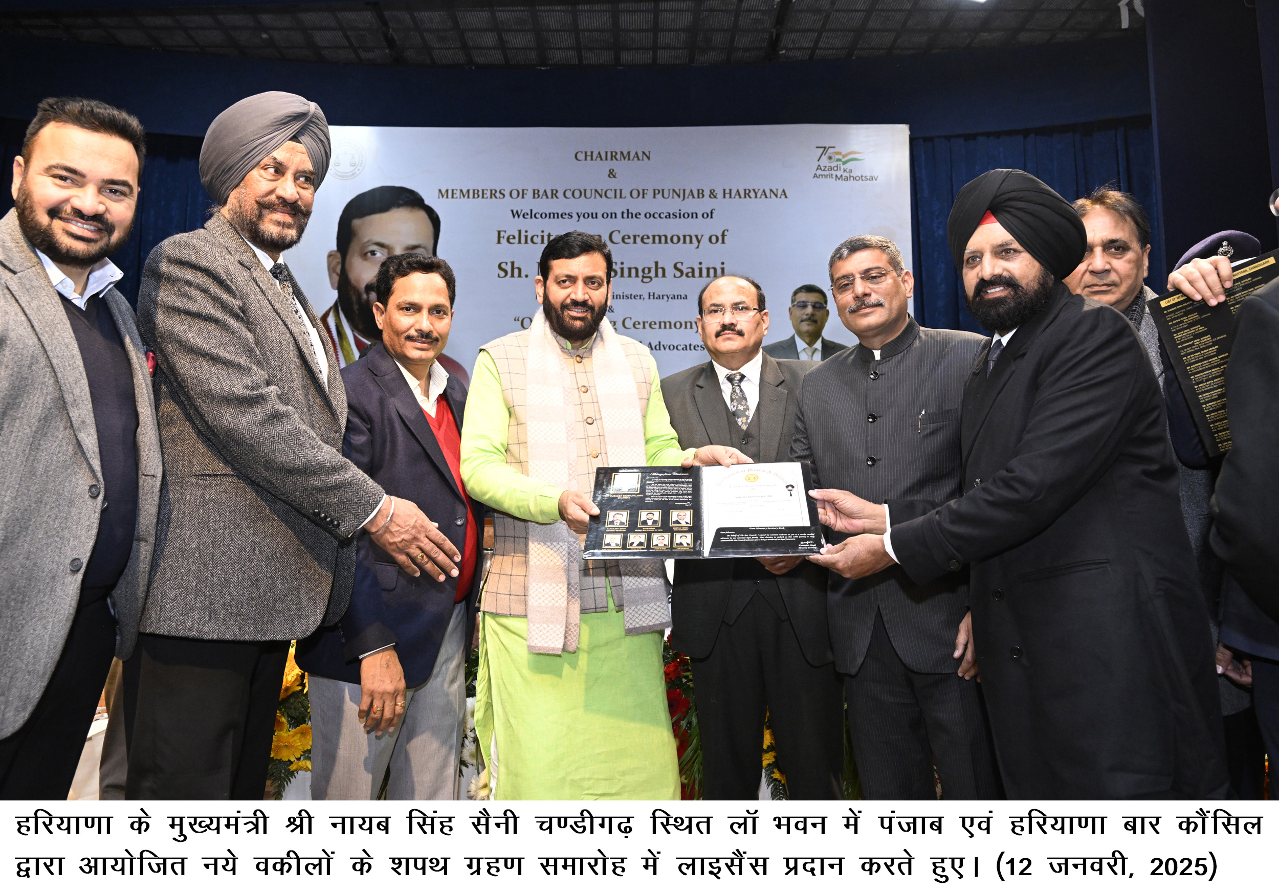 मुख्यमंत्री श्री नायब सिंह सैनी ने यह बात चण्डीगढ़ स्थित लॉ भवन में हरियाणा एवं पंजाब बार कौसिंल द्वारा आयोजित नये वकीलों के शपथ ग्रहण समारोह के दौरान कही। इस दौरान मुख्यमंत्री ने 1145 नये वकीलों को शपथ दिलवाई और उन्हें लाइसेंस प्रदान किए।