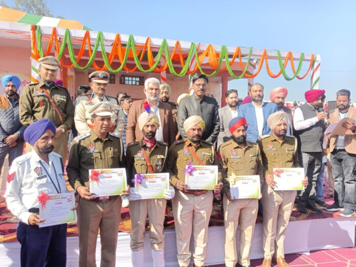 ਗਣਤੰਤਰਤਾ ਦਿਵਸ ਮੌਕੇ ਪੰਜਾਬ ਪੁਲਿਸ ਦੇ ਪਰੇਡ ਕਮਾਂਡਰ ਅਵਤਾਰ ਸਿੰਘ ਰਾਜਪਾਲ ਡੀ.ਐਸ.ਪੀ. ਦੀ ਅਗਵਾਈ ਵਿੱਚ  ਪੰਜਾਬ ਪੁਲਿਸ, ਪੰਜਾਬ ਪੁਲਿਸ (ਮਹਿਲਾ), ਪੰਜਾਬ ਹੋਮ ਗਾਰਡਜ, ਐਨ.ਸੀ.ਸੀ. ਅਤੇ ਸਕਾਊਂਟ  ਦੀਆਂ ਟੁਕੜੀਆਂ ਵਲੋਂ ਰਾਸ਼ਟਰੀ ਝੰਡੇ ਨੂੰ ਸਲਾਮੀ ਦਿੱਤੀ ਗਈ ਅਤੇ ਮਾਰਚ ਪਾਸਟ ਪੇਸ਼ ਕੀਤਾ ਗਿਆ ਅਤੇ ਪੰਜਾਬ ਪੁਲਿਸ ਦੇ ਬੈਂਡ ਵਲੋਂ ਰਾਸ਼ਟਰੀ ਧੁੰਨ ਬਜਾਈ ਗਈ ਅਤੇ ਵੱੱਖ-ਵੱਖ ਸਕੂਲਾਂ ਦੇ ਬੱਚਿਆਂ ਵਲੋ ਸਭਿਆਚਾਰਕ ਪ੍ਰੋਗਰਾਮ ਪੇਸ਼ ਕੀਤਾ ਗਿਆ।