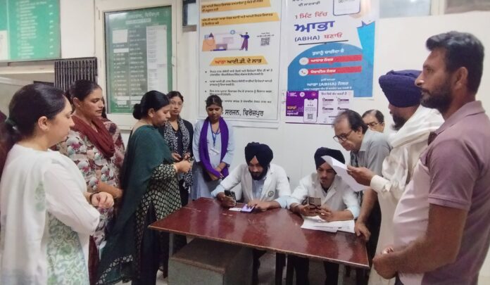 ਫ਼ੋਟੋ:- ਸਰਕਾਰੀ ਹਸਪਤਾਲ਼ ਫ਼ਿਰੋਜ਼ਪੁਰ ਵਿਖ਼ੇ ਆਭਾ ਆਈ ਡੀ ਬਣਾਉਂਦੇ ਅਤੇ ਜਾਣਕਾਰੀ ਦਿੰਦੇ ਹੋਏ ਸਿਹਤ ਵਿਭਾਗ ਦੇ ਮੁਲਾਜ਼ਮ