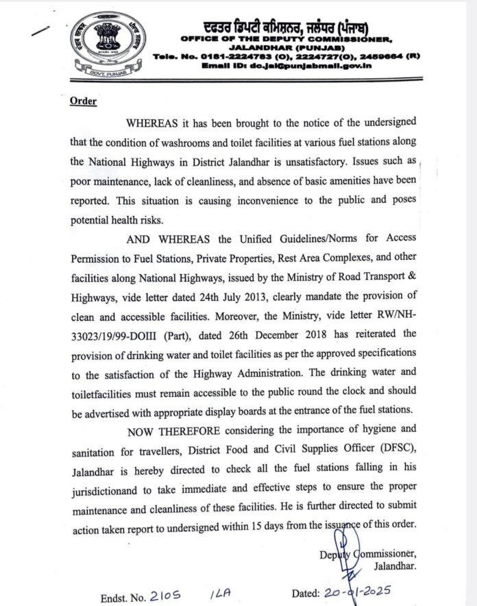 जारी आदेश में डिप्टी कमिश्नर ने कहा कि उनके संज्ञान में आया है कि जालंधर जिले में राष्ट्रीय राजमार्ग के साथ लगते विभिन्न पेट्रोल पंपों पर वॉशरूम और शौचालयों की स्थिति संतोषजनक नहीं है। खराब रखरखाव, साफ-सफाई की कमी और बुनियादी सुविधाओं की कमी जैसे मुद्दे सामने आए हैं। इस स्थिति से जनता को असुविधा हो रही है।