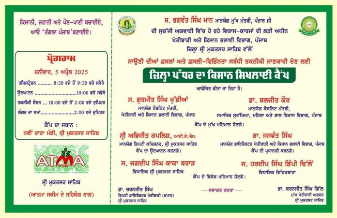 ਮੁੱਖ ਮੰਤਰੀ ਪੰਜਾਬ ਸ. ਭਗਵੰਤ ਸਿੰਘ ਮਾਨ ਦੀ ਅਗਵਾਈ ਹੇਠ ਹੋ ਰਹੇ ਵਿਕਾਸ ਕਾਰਜਾਂ ਦੀ ਲੜੀ ਅਧੀਨ ਖੇਤੀਬਾੜੀ ਅਤੇ ਕਿਸਾਨ ਭਲਾਈ ਵਿਭਾਗ, ਪੰਜਾਬ ਵੱਲੋਂ ਕਿਸਾਨਾਂ ਨੂੰ ਸਾਉਣੀ ਦੀਆਂ ਫ਼ਸਲਾਂ, ਪਰਾਲੀ ਪ੍ਰਬੰਧਨ ਅਤੇ ਫ਼ਸਲੀ ਵਿਭਿੰਨਤਾ ਸਬੰਧੀ ਤਕਨੀਕੀ ਜਾਣਕਾਰੀ ਦੇਣ ਲਈ ਜ਼ਿਲ੍ਹਾ ਪੱਧਰ ਦਾ ਕਿਸਾਨ ਸਿਖਲਾਈ ਕੈਂਪ ਨਵੀਂ ਦਾਣਾ ਮੰਡੀ, ਸ੍ਰੀ ਮੁਕਤਸਰ ਸਾਹਿਬ ਵਿਖੇ 5 ਅਪ੍ਰੈਲ 2025 ਦਿਨ ਸ਼ਨੀਵਾਰ ਨੂੰ ਆਯੋਜਿਤ ਕੀਤਾ ਜਾ ਰਿਹਾ ਹੈ। ਇਹ ਜਾਣਕਾਰੀ ਮੁੱਖ ਖੇਤੀਬਾੜੀ ਅਫ਼ਸਰ ਡਾ. ਕਰਨਜੀਤ ਸਿੰਘ ਗਿੱਲ ਨੇ ਸਾਂਝੀ ਕੀਤੀ। ਉਨ੍ਹਾਂ ਦੱਸਿਆ ਕਿ ਇਸ ਜ਼ਿਲ੍ਹਾ ਪੱਧਰੀ ਕਿਸਾਨ ਸਿਖਲਾਈ ਕੈਂਪ ਦੌਰਾਨ ਕੈਬਨਿਟ ਮੰਤਰੀ, ਖੇਤੀਬਾੜੀ ਅਤੇ ਕਿਸਾਨ ਭਲਾਈ ਵਿਭਾਗ ਪੰਜਾਬ ਸ. ਗੁਰਮੀਤ ਸਿੰਘ ਖੁੱਡੀਆਂ ਅਤੇ ਕੈਬਨਿਟ ਮੰਤਰੀ, ਸਮਾਜਿਕ ਸੁਰੱਖਿਆ, ਮਹਿਲਾ ਅਤੇ ਬਾਲ ਵਿਕਾਸ ਵਿਭਾਗ, ਪੰਜਾਬ ਡਾ. ਬਲਜੀਤ ਕੌਰ ਮੁੱਖ ਮਹਿਮਾਨ ਅਤੇ ਵਿਧਾਇਕ ਸ੍ਰੀ ਮੁਕਤਸਰ ਸਾਹਿਬ ਸ. ਜਗਦੀਪ ਸਿੰਘ ਕਾਕਾ ਬਰਾੜ ਅਤੇ ਵਿਧਾਇਕ ਗਿੱਦੜਬਾਹਾ ਸ. ਹਰਦੀਪ ਸਿੰਘ ਡਿੰਪੀ ਢਿੱਲੋਂ ਵਿਸ਼ੇਸ਼ ਮਹਿਮਾਨ ਵਜੋਂ ਸ਼ਿਰਕਿਤ ਕਰਨਗੇ। ਉਨ੍ਹਾਂ ਵਧੇਰੇ ਜਾਣਕਾਰੀ ਦਿੰਦਿਆਂ ਦੱਸਿਆ ਕਿ ਡਿਪਟੀ ਕਮਿਸ਼ਨਰ ਸ੍ਰੀ ਅਭਿਜੀਤ ਕਪਲਿਸ਼ ਕੈਂਪ ਦਾ ਉਦਘਾਟਨ ਕਰਨਗੇ ਅਤੇ ਡਾਇਰੈਕਟਰ ਖੇਤੀਬਾੜੀ ਅਤੇ ਕਿਸਾਨ ਭਲਾਈ ਵਿਭਾਗ ਡਾ. ਜਸਵੰਤ ਸਿੰਘ ਕੈਂਪ ਦੀ ਪ੍ਰਧਾਨਗੀ ਕਰਨਗੇ। ਇਸ ਮੌਕੇ ਉਨ੍ਹਾਂ ਸਮੂਹ ਕਿਸਾਨ ਵੀਰਾਂ ਨੂੰ ਅਪੀਲ ਕੀਤੀ ਕਿ ਪੰਜਾਬ ਸਰਕਾਰ ਵੱਲੋਂ ਸਾਉਣੀ ਦੀਆਂ ਫ਼ਸਲਾਂ ਅਤੇ ਫ਼ਸਲੀ ਵਿਭਿੰਨਤਾ ਸਬੰਧੀ ਲਗਾਏ ਜਾ ਰਹੇ ਇਸ ਕੈਂਪ ਵਿੱਚ ਵੱਧ ਤੋਂ ਵੱਧ ਗਿਣਤੀ ਵਿੱਚ ਸ਼ਾਮਲ ਹੋ ਕੇ ਜਾਣਕਾਰੀ ਪ੍ਰਾਪਤ ਕਰਨ।