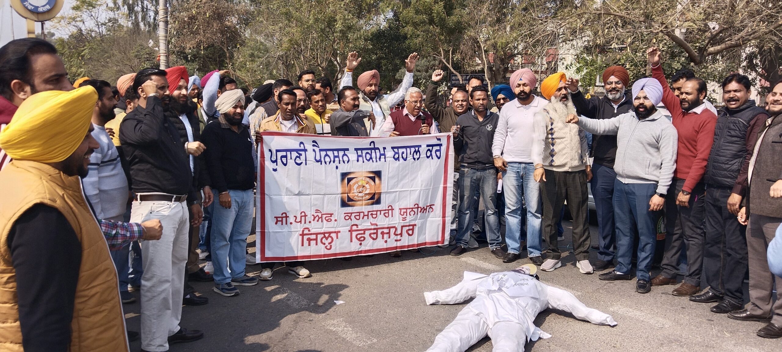 ਸੀ.ਪੀ.ਐਫ. ਕਰਮਚਾਰੀ ਯੂਨੀਅਨ ਜ਼ਿਲ੍ਹਾ ਫਿਰੋਜ਼ਪੁਰ ਵੱਲੋ ਪੁਰਾਣੀ ਪੈਨਸ਼ਨ ਸਕੀਮ ਦੀ ਮੰਗ ਨੂੰ ਲੈ ਕੇ ਕੀਤੀ ਗਏ ਅਰਥੀ ਫੂਕ ਮੁਜ਼ਾਹਰੇ ਵਿਚ ਨਾਹਰੇਬਾਜ਼ੀ ਕਰਦੇ ਹੋਏ ਮੁਲਾਜ਼ਮ ।