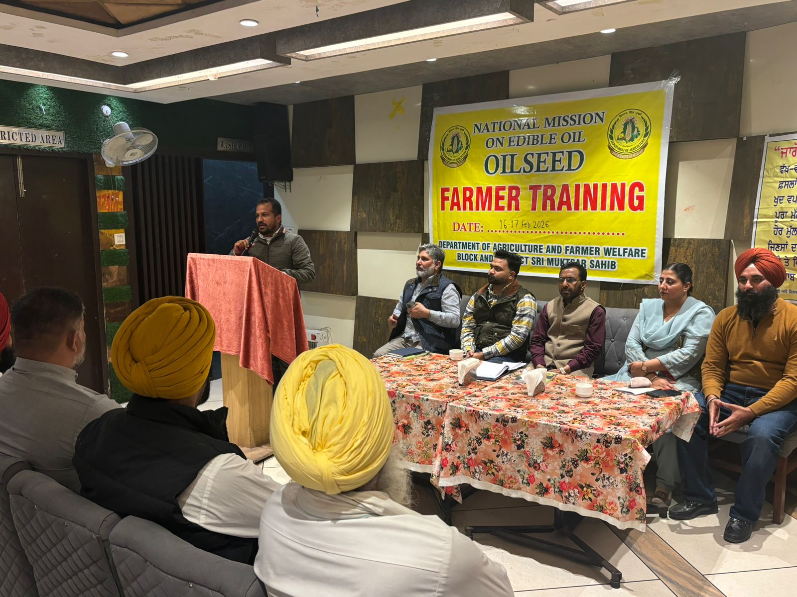 Punjab Desk : ਕੌਮੀ ਤੇਲ ਬੀਜ ਮਿਸ਼ਨ ਅਧੀਨ ਮੁੱਖ ਖੇਤੀਬਾੜੀ ਅਫ਼ਸਰ ਸ੍ਰੀ ਮੁਕਤਸਰ ਸਾਹਿਬ ਡਾ. ਜਗਸੀਰ ਸਿੰਘ ਦੇ ਦਿਸ਼ਾ-ਨਿਰਦੇਸ਼ ਅਤੇ ਸਹਾਇਕ ਪੌਦਾ ਸੁਰੱਖਿਆ ਅਫਸਰ ਸ੍ਰੀ ਮੁਕਤਸਰ ਸਾਹਿਬ ਡਾ. ਰਾਜਵਿੰਦਰ ਸਿੰਘ ਦੀ ਅਗਵਾਈ ਹੇਠ ਏਡੀਓ ਲੁਬਾਣਿਆਵਾਲੀ ਡਾ. ਜੋਬਨਦੀਪ ਸਿੰਘ ਵਲੋਂ ਤੇਲ ਬੀਜ ਫਸਲਾਂ ਦੀ ਕਾਸ਼ਤ ਨੂੰ ਪ੍ਰਫੁੱਲਤ ਕਰਨ ਲਈ ਕਿਸਾਨਾਂ ਦੀ ਟ੍ਰੇਨਿੰਗ ਦਾ ਸਿਟੀ ਹੋਟਲ ਸ੍ਰੀ ਮੁਕਤਸਰ ਸਾਹਿਬ ਵਿਖੇ ਅਯੋਜਨ ਕੀਤਾ ਗਿਆ।