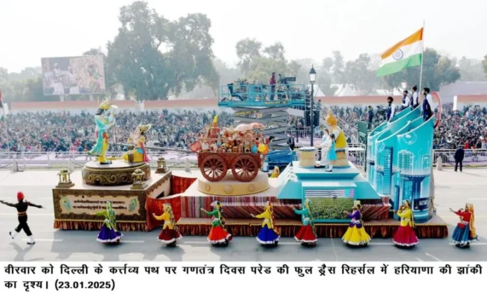 वीरवार को दिल्ली के कर्तव्य पथ पर गणतंत्र दिवस परेड की फुल ड्रेस रिहर्सल आयोजित की गई, जिसमें हरियाणा की झांकी प्रदर्शित हुई। यह झांकी अब रविवार को गणतंत्र दिवस समारोह में देशवासियों के समक्ष फिर से प्रदर्शित होगी।