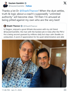 ਕਾਂਗਰਸ ਨੇਤਾ ਸ਼ਸ਼ੀ ਥਰੂਰ ਨੇ ਨਾਗਪੁਰ ਵਿੱਚ ਮੁਲਾਕਾਤ ਤੋਂ ਬਾਅਦ ਗੰਭੀਰ ਦੀ ਤਾਰੀਫ਼ ਕਰਦਿਆਂ ਇੱਕ ਪੋਸਟ ਕੀਤੀ ਸੀ। ਇਸਦੇ ਜਵਾਬ ਵਿੱਚ ਗੰਭੀਰ ਨੇ ਲਿਖਿਆ ਕਿ ਜਦੋਂ ਹਲਚਲ ਥਮ ਜਾਵੇਗੀ, ਤਦ ਸੱਚਾਈ ਅਤੇ ਤਰਕ ਆਪਣੇ ਆਪ ਸਾਹਮਣੇ ਆ ਜਾਣਗੇ। ਉਨ੍ਹਾਂ ਨੇ ਇਹ ਵੀ ਕਿਹਾ ਕਿ ਉਨ੍ਹਾਂ ਨੂੰ ਹੈਰਾਨੀ ਹੈ ਕਿ ਉਨ੍ਹਾਂ ਨੂੰ ਆਪਣੇ ਹੀ ਲੋਕਾਂ ਦੇ ਖ਼ਿਲਾਫ਼ ਖੜ੍ਹਾ ਕੀਤਾ ਜਾ ਰਿਹਾ ਹੈ, ਜਦੋਂਕਿ ਉਹ ਸਭ ਦੇਸ਼ ਦੇ ਸਭ ਤੋਂ ਵਧੀਆ ਖਿਡਾਰੀ ਹਨ।
