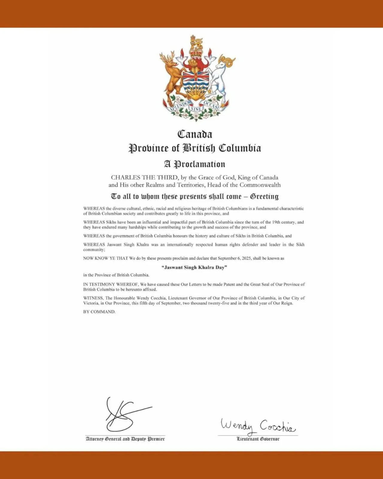 ਬ੍ਰਿਟਿਸ਼ ਕੋਲੰਬੀਆ ਦੀ ਲੈਫਟੀਨੈਂਟ ਗਵਰਨਰ ਵੈਂਡੀ ਕੋਕੀਆ ਨੇ ਐਲਾਨੀ ਪੱਤਰ ‘ਤੇ ਦਸਤਖਤ ਕਰਕੇ ਇਹ ਦਿਨ ਘੋਸ਼ਿਤ ਕੀਤਾ। ਸਰਕਾਰ ਨੇ ਉਨ੍ਹਾਂ ਨੂੰ “ਅੰਤਰਰਾਸ਼ਟਰੀ ਪੱਧਰ ‘ਤੇ ਮਨੁੱਖੀ ਅਧਿਕਾਰਾਂ ਦੇ ਰਾਖੇ” ਵਜੋਂ ਸਨਮਾਨਿਤ ਕੀਤਾ ਅਤੇ ਕਿਹਾ ਕਿ ਇਹ ਦਿਨ ਉਨ੍ਹਾਂ ਦੀ ਵਿਰਾਸਤ ਨੂੰ ਯਾਦ ਕਰਨ ਅਤੇ ਇਨਸਾਫ਼ ਦੀ ਮੰਗ ਜਾਰੀ ਰੱਖਣ ਦਾ ਪ੍ਰਤੀਕ ਹੈ।