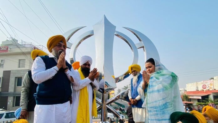 Punjab Desk : ਨੌਵੇਂ ਪਾਤਸ਼ਾਹ ਸ੍ਰੀ ਗੁਰੂ ਤੇਗ ਬਹਾਦਰ ਸਾਹਿਬ ਜੀ ਦੇ 350ਵੇਂ ਸ਼ਹੀਦੀ ਦਿਹਾੜੇ ਦੇ ਸਨਮੁੱਖ ਨਾਨਕਿਆਣਾ ਚੌਕ ਵਿਖੇ ਖੰਡਾ ਸਾਹਿਬ ਸੁਸ਼ੋਭਿਤ ਕੀਤਾ ਗਿਆ ਹੈ, ਜਿਸ ਨੂੰ ਅੱਜ ਹਲਕਾ ਵਿਧਾਇਕ ਸ਼੍ਰੀਮਤੀ ਨਰਿੰਦਰ ਕੌਰ ਭਰਾਜ ਵੱਲੋਂ ਸੰਗਤ ਨੂੰ ਸਮਰਪਿਤ ਕੀਤਾ ਗਿਆ।