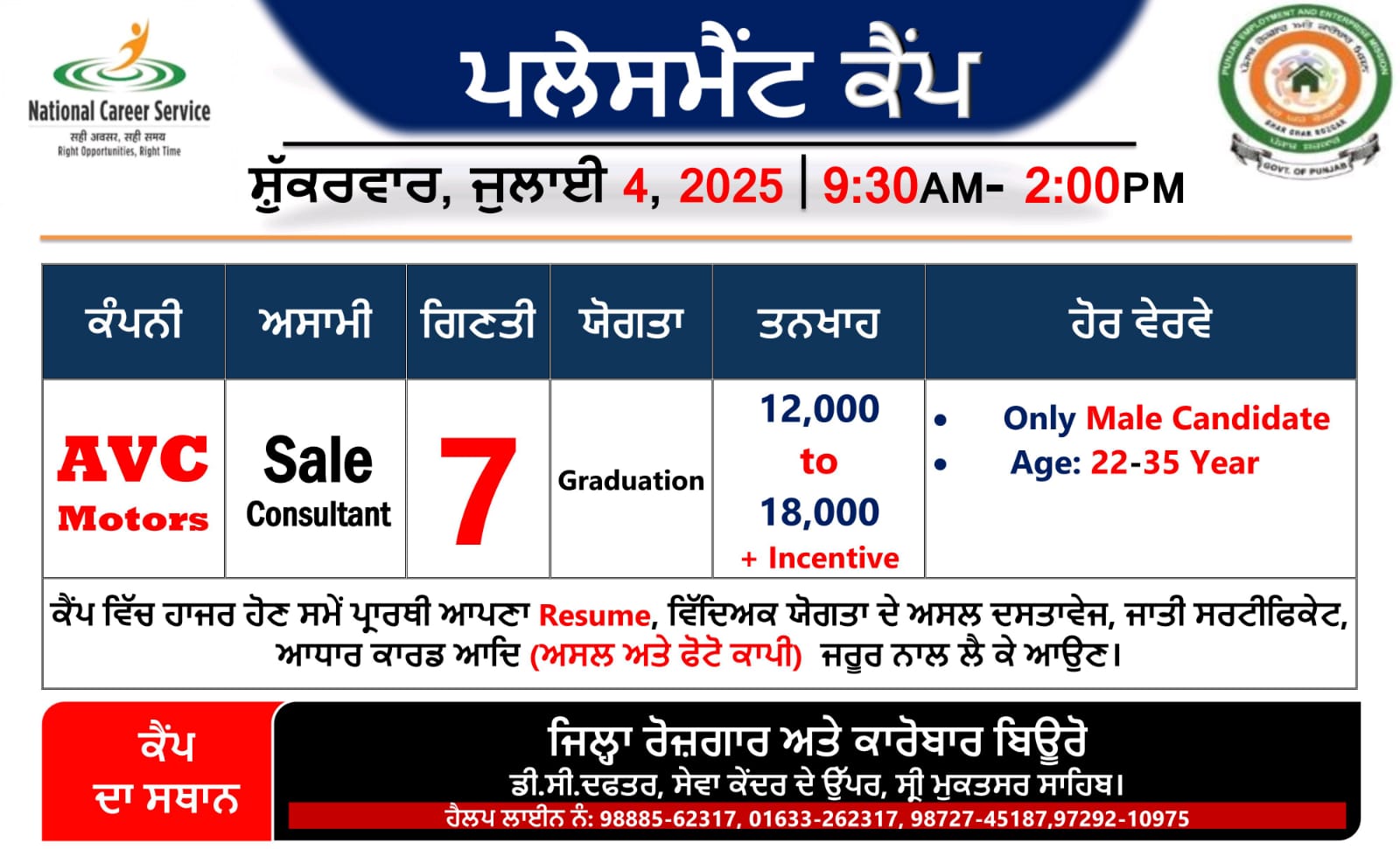 Punjab Desk : ਜ਼ਿਲ੍ਹਾ ਰੋਜ਼ਗਾਰ ਅਤੇ ਕਾਰੋਬਾਰ ਬਿਊਰੋ, ਸ੍ਰੀ ਮੁਕਤਸਰ ਸਾਹਿਬ ਵਿਖੇ 04 ਜੁਲਾਈ 2025 ਦਿਨ ਸ਼ੁੱਕਰਵਾਰ ਨੂੰ ਪਲੇਸਮੈਂਟ ਕੈਂਪ ਲਗਾਇਆ ਜਾ ਰਿਹਾ ਹੈ, ਇਹ ਜਾਣਕਾਰੀ ਪਲੇਸਮੈਂਟ ਅਫ਼ਸਰ ਦਲਜੀਤ ਸਿੰਘ ਬਰਾੜ ਨੇ ਦਿੱਤੀ। ਉਨ੍ਹਾਂ ਕਿਹਾ ਕਿ ਇਸ ਪਲੇਸਮੈਂਟ ਕੈਂਪ ਵਿੱਚ ਏ.ਵੀ.ਸੀ. ਮੋਟਰ ਪ੍ਰਾਈਵੇਟ ਲਿਮਟਿਡ ਕੰਪਨੀ ਵੱਲੋਂ ਸੇਲਜ ਕੰਸਲਟੈਂਟ ਦੀ ਅਸਾਮੀ ਲਈ ਕੇਵਲ ਲੜਕਿਆਂ ਦੀ ਇੰਟਰਵਿਊ ਕੀਤੀ ਜਾਣੀ ਹੈ। ਇੰਟਰਵਿਊ ਲਈ ਵਿੱਦਿਅਕ ਯੋਗਤਾ ਗ੍ਰੈਜੂਏਸ਼ਨ ਪਾਸ, ਉਮਰ 22 ਤੋਂ 35 ਸਾਲ ਹੋਣੀ ਚਾਹੀਦੀ ਹੈ।