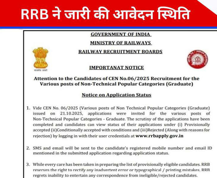 RRB ਨੇ ਦੱਸਿਆ ਹੈ ਕਿ ਅਸਥਾਈ ਤੌਰ ‘ਤੇ ਮਨਜ਼ੂਰ ਕੀਤੀਆਂ ਗਈਆਂ ਅਰਜ਼ੀਆਂ ਵਾਲੇ ਉਮੀਦਵਾਰ ਅਗਲੇ ਚਰਨ ਵਿੱਚ ਸ਼ਾਮਲ ਹੋ ਸਕਣਗੇ, ਜਦਕਿ ਸ਼ਰਤਾਂ ਸਹਿਤ ਮਨਜ਼ੂਰ ਕੀਤੀਆਂ ਅਰਜ਼ੀਆਂ ਲਈ ਕੁਝ ਜ਼ਰੂਰੀ ਸ਼ਰਤਾਂ ਪੂਰੀਆਂ ਕਰਨੀ ਲਾਜ਼ਮੀ ਹੋਣਗੀਆਂ। ਰੱਦ ਕੀਤੀਆਂ ਗਈਆਂ ਅਰਜ਼ੀਆਂ ਦੇ ਕਾਰਨ ਵੀ ਉਮੀਦਵਾਰਾਂ ਨੂੰ ਸਪਸ਼ਟ ਤੌਰ ‘ਤੇ ਦੱਸੇ ਗਏ ਹਨ। ਪਾਰਦਰਸ਼ਿਤਾ ਨੂੰ ਧਿਆਨ ਵਿੱਚ ਰੱਖਦਿਆਂ, ਬੋਰਡ ਵੱਲੋਂ ਐਸਐਮਐਸ ਅਤੇ ਈ-ਮੇਲ ਰਾਹੀਂ ਵੀ ਅਰਜ਼ੀ ਸਟੇਟਸ ਦੀ ਜਾਣਕਾਰੀ ਭੇਜੀ ਜਾ ਰਹੀ ਹੈ।
