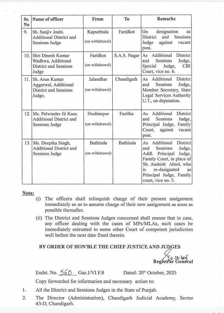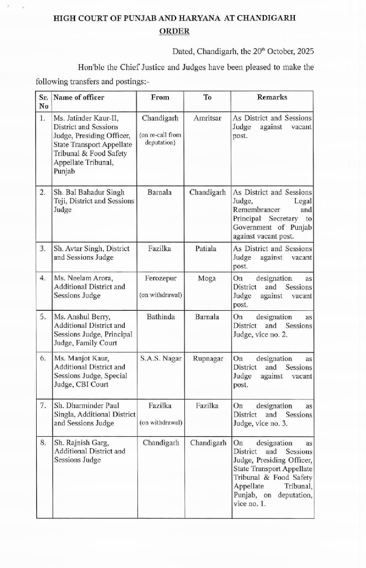 ਆਦੇਸ਼ ਮੁਤਾਬਕ, ਜਤਿੰਦਰ ਕੌਰ ਨੂੰ ਅੰਮ੍ਰਿਤਸਰ ਦਾ ਨਵਾਂ ਜ਼ਿਲ੍ਹਾ ਅਤੇ ਸੈਸ਼ਨ ਜੱਜ ਨਿਯੁਕਤ ਕੀਤਾ ਗਿਆ ਹੈ, ਜਦਕਿ ਅਵਤਾਰ ਸਿੰਘ ਦਾ ਤਬਾਦਲਾ ਫਾਜ਼ਿਲਕਾ ਤੋਂ ਪਟਿਆਲਾ ਕੀਤਾ ਗਿਆ ਹੈ। ਇਸਦੇ ਨਾਲ ਹੀ ਹਰਿਆਣਾ ਵਿੱਚ ਵੀ 29 ਜੱਜਾਂ ਦੇ ਤਬਾਦਲੇ ਕੀਤੇ ਗਏ ਹਨ।